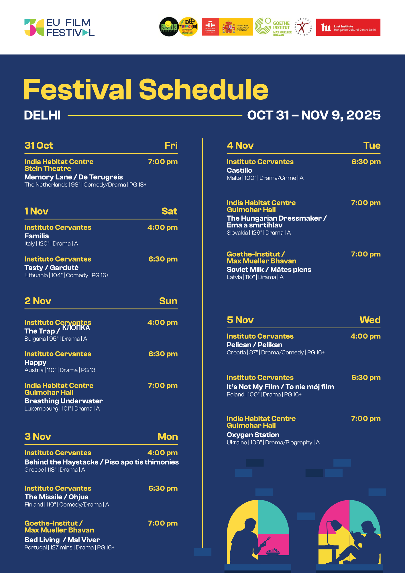 El festival, que celebra este año su 30.ª edición, proyectará una variedad de películas de cada Estado miembro de la UE, mostrando películas contemporáneas y aclamadas del circuito cinematográfico europeo. Además de las proyecciones, el festival también acoge diversos actos paralelos, como talleres, clases magistrales y mesas redondas con cineastas, actores, guionistas y expertos cinematográficos europeos, con el fin de promover un intercambio cultural atractivo.